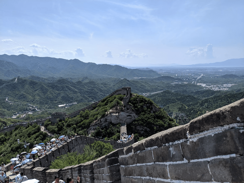 接下来便是攀城墙的艰苦时光: 在暑期出行攀登长城,最大的问题可能并不是烈日当空,而是众多的游客互相拥挤,使得长城一路上寸步难行。路上基本是在人海中挪动,偶尔被撑开的太阳伞戳中,偶尔被踩中,反正这点体验极差。